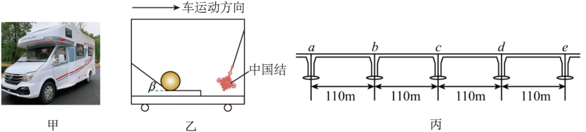 的斜面放在水平置物架上,房车车壁上有一个用细长轻绳悬挂的小中国结(可看做质点),如图乙所示。ab、bc、cd、de是港珠澳大桥的四段110m等跨钢箱连续梁桥(如图丙所示),房车行驶到a点时开始加速,先做匀加速直线运动,达到29.5m/s后做匀速直线运动。在ab段小明发现中国结偏离车壁角度始终为