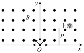 平面向外的匀强磁场,坐标原点O处有一粒子源,可向x轴和x轴上方的各个方向均匀地发射速度大小均为v、质量为m、带电荷量为q的同种带电粒子。在x轴上距离原点L处垂直于x轴放置一个长度为L、厚度不计且能接收带电粒子的薄金属板P(粒子一旦打在金属板P上,其速度立即变为0)。现观察到沿y轴正方向射出的粒子恰好打在薄金属板的上端,且速度方向与x轴平行。不计带电粒子的重力和粒子间相互作用力,则下列说法正确的是( )