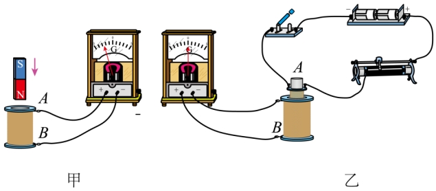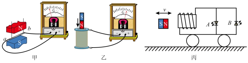 (3)图丙中,小车静止在光滑水平地面上,小车上固定有一个线圈,线圈与反向并联的发光二极管(具有单向导电性,通有正向电流时会发光)相连,当磁铁迅速靠近线圈时,小车会被排斥远离磁铁,此过程原磁场方向与感应电流产生的磁场方向相反;当磁铁迅速远离线圈时,小车会被吸引追随磁铁运动,此过程二极管(填“A”或“B”)亮。