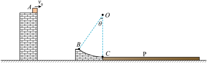 水平速度离开平台,落至地面时,恰能无碰撞地沿圆弧切线从A点切入光滑竖直圆弧轨道,并沿轨道下滑。