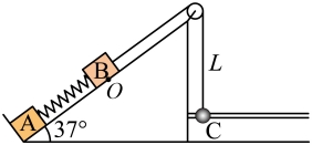 固定光滑长斜面,下端有一固定挡板,两小物块A、B放在斜面上,用与斜面平行的轻弹簧连接。一轻绳跨过轻小定滑轮的左端与B相连,右端与套在光滑水平杆上的小球C相连,A、B、C的质量均为m=2kg,系统静止时,滑轮左侧轻绳与斜面平行,右侧轻绳竖直,竖直长度