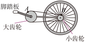 如图所示为脚踏自行车的传动装置简化图,A、B是大小齿轮边缘的点。现架起后轮转动脚踏板,传动链条在各轮转动中不打滑,则( )