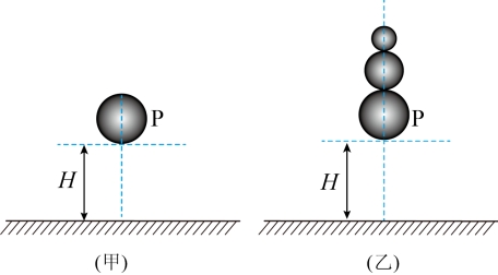,运动过程中重心始终处于同一竖直线上,各球之间发生弹性碰撞,碰撞时间极短,每次释放时P球距地面高度均为H,与地面第一次碰撞过程中的能量损失均保持不变,重力加速度为g,忽略空气阻力。