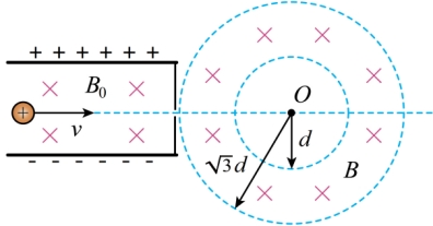 。一质量为m、电荷量为q的正粒子水平穿过速度选择器并从右侧小孔沿着圆心O的方向射入环形匀强磁场。已知环形匀强磁场内径为d,外径为