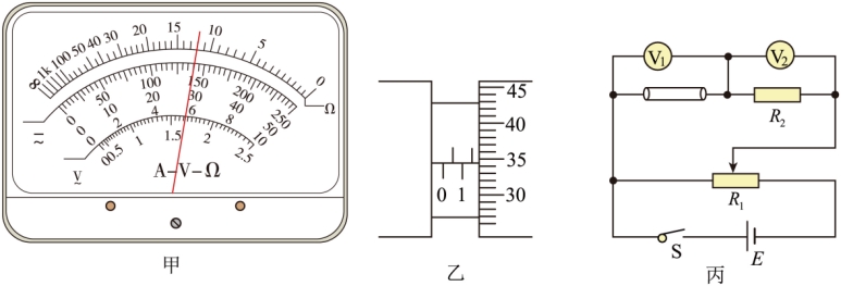 (1)实验前用多用电表粗略测量圆柱体的电阻,选择“×1”倍率的欧姆挡,欧姆调零后再进行测量,多用电表的示数如图甲所示,多用电表读数为Ω;用直尺测得金属圆柱体的长度为50cm,用螺旋测微器测量圆柱体的直径,测量结果如图乙所示,其读数为mm。