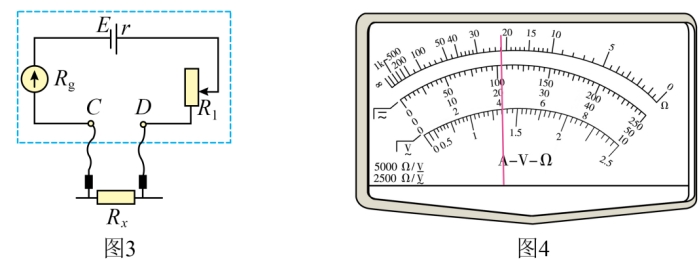 (2)该同学紧接着用(1)中的电池给一个欧姆表供电。该欧姆表内部结构如图3所示,表盘刻度如图4所示(中央刻度处示数为“15”),已知灵敏电流计