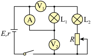 如图所示,电表均为理想电表,电源内阻的大小为r,两灯泡的电阻均为2r。闭合开关,此时,两灯泡正常发光。将滑动变阻器滑片向上滑动,电压表