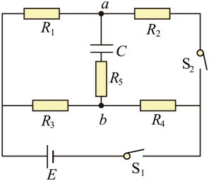 在如图所示的电路中,定值电阻R1=3Ω、R2=2Ω、R3=1Ω、R4=3Ω、R5=4Ω,电容器的电容C=4μF,电源的电动势E=10V,内阻不计。闭合开关S1、S2,电路稳定后,求:
