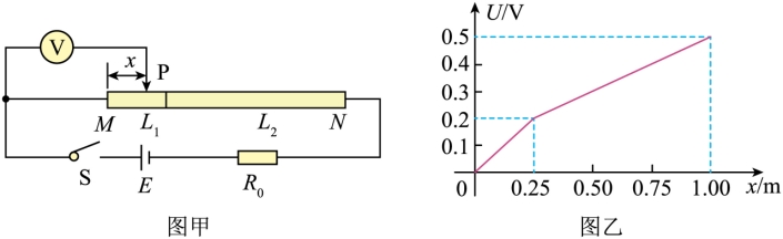 无缝连接成一段导体,总长度为1.00m,接入图甲电路。闭合开关S,滑片P从M端滑到N端,理想电压表读数U随滑片P的滑动距离x的变化关系如图乙,则导体