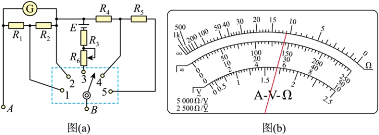 ;虚线方框为换挡开关;A端和B端分别与两表笔相连。该多用电表共有5个挡位,分别为直流电压5V挡和10V挡,直流电流10mA挡和25mA挡,欧挡。则以下说法中正确的是( )