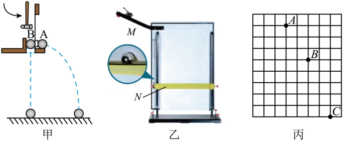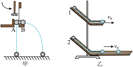 (2)如图乙所示的实验:将两个光滑轨道固定在同一竖直面内,轨道末端水平,把两个质量相等的小钢球,从斜面的相同高度由静止同时释放,球1落到水平板上时_______(选填“能”或“不能”)击中球2;