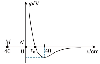 和坐标原点处,若取无穷远处电势为0,则两点电荷所形成电场的电势在x轴正半轴上的分布如图所示,图线与x轴交于x0处,x=40cm处电势最低。现有一正点电荷q从x0处由静止释放,其只在电场力作用下运动。下列说法中正确的是( )