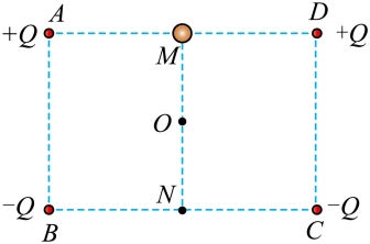 的长方形ABCD,M、N分别为AD与BC的中点。四个电荷量均为Q(Q未知)的点电荷位于长方形的四个顶点,A、D处点电荷带正电, B、C处点电荷带负电。一个质量为m、电荷量为