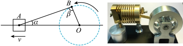 逆时针匀速转动时,滑块在水平横杆上左右滑动,连杆AB与水平方向夹角为α,AB杆与OB杆的夹角为β。在滑块A从右向左滑动过程中()