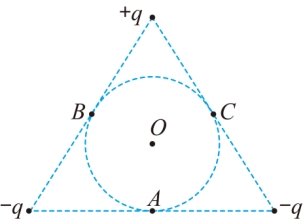 如图所示,两个负点电荷和一个正点电荷固定在等边三角形的三个顶点上,三个电荷的电荷量均相等,O为三角形内切圆的圆心,A、B、C为三个切点,则( )