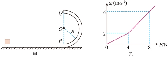 如图甲所示,质量为M的轨道静止在光滑水平面上,轨道水平部分的上表面粗糙,竖直半圆形部分的表面光滑,两部分在P点平滑连接,Q为轨道的最高点。质量为m的小物块静置在轨道水平部分上,与水平轨道间的动摩擦因数为μ,最大静摩擦力等于滑动摩擦力。已知轨道半圆形部分的半径