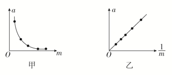 通过观察记录的数据发现,F一定时,m越大,a越小,这可能是a与m成反比,也可能是a与m2成反比,甚至是更复杂的关系。先从最简单的情况入手,检验是否“a与m成反比”。作出am图像,如图甲所示,因为am图像是曲线,由图像可定性地判断出a随m的增大而减小,但是不能判断二者的具体关系。我们采取“化曲为直”的方法,以a为纵坐标,以m为横坐标,作出am图像,如图乙所示,若am图像是一条过原点的直线,说明a与m成正比,即a与m成反比。如果不是这样,则需进一步分析。