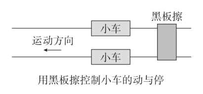 两辆小车后端各系一条细线,用一个物体,例如黑板擦,把两条细线同时按压在木板上,如图所示。抬起黑板擦,两辆小车同时开始运动,按下黑板擦,两辆小车同时停下来。用刻度尺测出两辆小车移动的位移x1、x2。由于两辆小车运动时间t相同,从它们的位移之比就可以得出加速度之比。