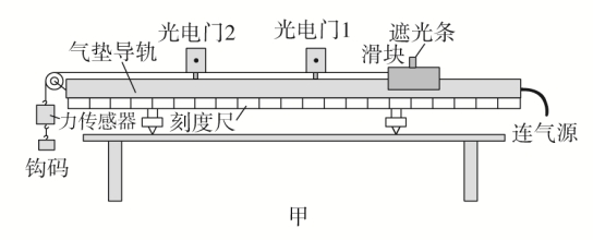 如图甲,利用光电门测出滑块通过光电门1、2时的速度v1、v2,再测出两光电门间距离x,由运动学公式v2-v1=2ax求加速度。