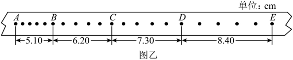 (2)实验中打出的一条纸带如图乙所示,每间隔4个计时点取一个计数点。已知该电源频率为50Hz,则A、B两点间的时间间隔T=s;由该纸带可求得小车的加速度a=