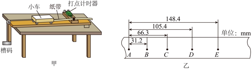 (2)在纸带中标注计数点A、B、C、D、E(各计数点间均有四个计时点未画出),测量数据如图乙所示,则小车加速度大小为m/s2;当打点计时器打下B点时,小车的速度大小为m/s。(结果均保留3位有效数字)