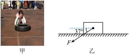 如图甲,在推轮胎加速跑比赛中,某参赛者保持两手臂相互平行,与水平地面间的夹角θ=37°(简化模型如图乙所示)。当该参赛者对轮胎的推力F1=30N时,轮胎静止不动,推力增大到F2=60N时,轮胎开始做匀加速直线运动,2s内前进距离为2m。已知轮胎的质量m=5kg,sin37°=0.6,cos37°=0.8,g取10m/s2。求轮胎: