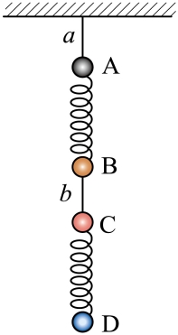 质量相同的A、B、C、D四个小球用轻质弹簧和轻绳按如图所示的方式连接在一起处于静止状态。已知重力加速度为g,现用火烧细绳b,则在细绳b烧断的瞬间,下列说法中正确的是( )