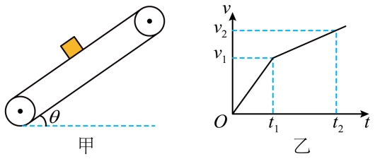 ,在传送带中点无初速度地放置一木块(视为质点),木块的速度随时间变化的图像如图乙所示,