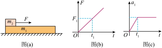光滑水平地面上有一质量为m1的长木板,木板的左上有一质量为m2的物块,如图(a)所示。用水平向右的拉力F作用在物块上,F随时间t的变化关系如图(b)所示,其中F1为t1时刻F的大小。木板的加速度a1随时间t的变化关系如图(c)所示。已知物块与木板间的动摩擦因数为μ,假设最大静摩擦力与相应的滑动摩擦力相等,重力加速度大小为g。则( )