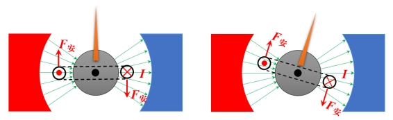 2.磁电式电表:电流在蹄形磁体的磁场中受安培力而转动,电流越大,指针转到角度也越大。