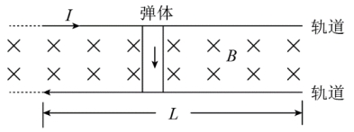例5. 如图所示为电磁轨道炮的工作原理图。质量为m的待发射弹体与轨道保持良好接触,并可在宽为d、长L的两平行水平轨道之间无摩擦滑动。电流I从一条轨道流入,通过弹体流回另一条轨道,用这种装置可以把弹体加速到