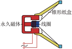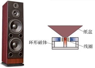 3.动圈式扬声器:通电线圈连接着喇叭,随着电流强弱的变化而振动发声。