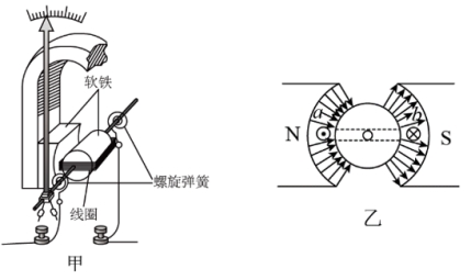 例6. 如图甲是磁电式表头的结构示意图,其中线圈是绕在一个与指针、转轴固连的铝框骨架(图中未指出)上,关于图示软铁、螺旋弹簧、铝框和通电效果,下列表述中正确的是( )