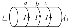 ,方向向右;圆环中通有相同大小的电流,且由于环a与环c的距离大于环b与环c的距离,则