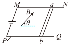 26.水平面上有电阻不计的U形导轨NMPQ,它们之间的宽度为L,M和P之间接入电动势为E的电源(不计内阻)。现垂直于导轨搁一根质量为m、电阻为R的金属棒ab,并加一个范围较大的匀强磁场,磁感应强度大小为B,方向与水平面夹角为θ且指向右上方,如图所示,问:
