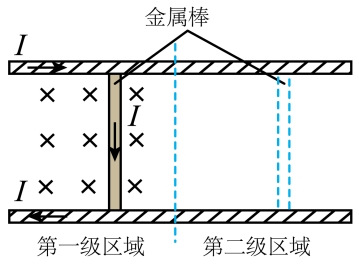 (2)(计算)每一级区域中金属棒被推进的距离若均为s,金属棒的质量为m,求金属棒从静止开始经过两级区域推进后的速度大小v=