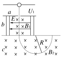 例3. 质谱仪原理如图所示,a为粒子加速器,电压为U1;b为速度选择器,磁场与电场正交,磁感应强度为B1,板间距离为d;c为偏转分离器,磁感应强度为B2。今有一质量为m、电荷量为+e的正电子(不计重力),经加速后,该粒子恰能通过速度选择器,粒子进入分离器后做半径为R的匀速圆周运动。求: