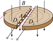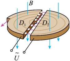 是两个中空的半圆形金属盒,置于与盒面垂直的匀强磁场中,它们接在电压为U、周期为T的交流电源上。位于