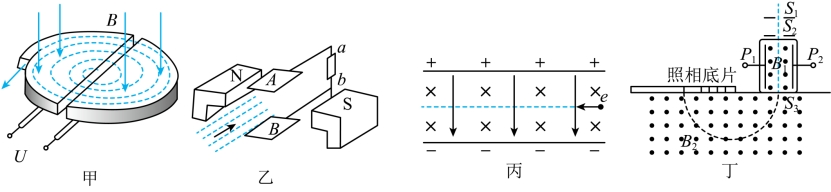 C.丙图中,带电粒子电子从右向左运动通过复合场时,电场力和洛伦兹力方向同向,粒子不会做直线运动,所以不是速度选择器,故C错误;