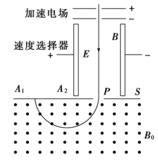 速度选择器中有垂直于纸面向里的匀强磁场,其磁感应强度大小为B1,上下两极板之间的电势差为U,板间距为d,两板间可视为匀强电场。不考虑粒子的重力,经加速电场加速的粒子从极板的正中央进入速度选择器。
