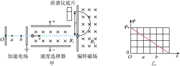 如图甲所示,一束含有多种成份的带电粒子(其所受重力均可忽略),无初速从O点进入加速电场,此电场中有O、a、b三点,沿着水平方向(x轴)上该三点的电势φ变化如图乙所示,经电场加速后进入速度选择器,最后,部分粒子经半个圆周的偏转射到质谱仪底片上。通过计算机的处理,可分析粒子成份。