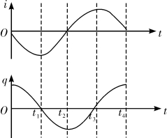 【解析】根据电流和电容器电量变化图线,作出对应0、t1、t2、t3、t4时刻的回路中电流的电容器电量状态示意图如下: