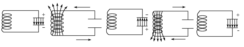 充电:电容器放电完毕时,由于线圈的自感作用,电流并不会立即减小为零,而要保持原来的方向继续流动,并逐渐减小。电容器在与原来相反的方向重新充电,电容器两极板带上相反的电荷,并且电荷逐渐增多。线圈的磁场逐渐减弱,电容器里的电场逐渐增强,磁场能逐渐转化为电场能。
