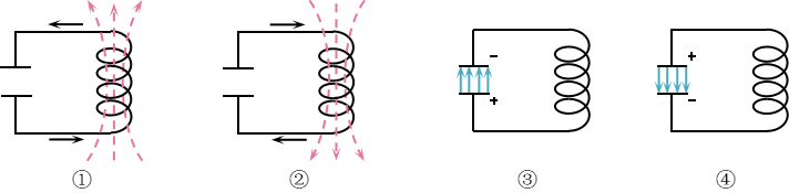 【解析】四幅图的图①中电容器极板上的电荷量为零,此时电流最大,则①之前必为放电过程,且放电开始时电容器下极板带正电,故图③在①之前;①之后必为充电过程,且充电结束电容器上极板带正电,故④在①之后;图②可以③之前的充电过程,也可以是④之后的放电过程,故四幅图排序为②③①④或者为③①④②,故B正确。