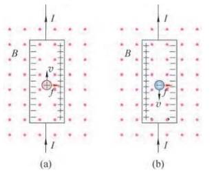 把这两种半导体薄片放在匀强磁场中,其平面与匀强磁场方向垂直,电流方向向上,如下图所示。