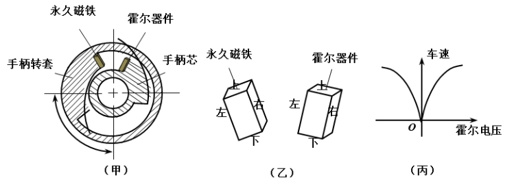 9.电动自行车速度控制是通过转动右把手实现的,这种转动把手称“霍尔转把”,属于传感器非接触控制。转把内部有永久磁铁和霍尔器件等,截面如图(甲)。开启电源时,在霍尔器件的上下面之间加一定的电压,形成电流,如图(乙)。随着转把的转动,其内部的永久磁铁也跟着转动,霍尔器件能输出控制车速的电压,已知电压与车速关系如图(丙)。以下关于“霍尔转把”叙述正确的是( )