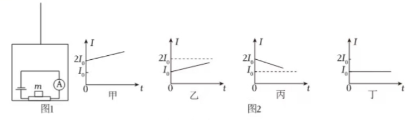 10.压敏电阻的阻值会随所受压力的增大而增大。某同学利用压敏电阻设计了一个判断电梯运动状态的装置,其装置示意图如图1所示。将压敏电阻平放在电梯内,受压面朝上,在上面放一物体m,电梯静止时电流表示数为2I0.电梯在不同的运动过程中,电流表的示数分别如图2中甲、乙、丙、丁所示,则下列判断中正确的是( )