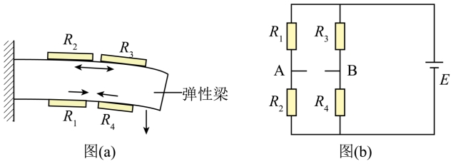 为四个完全相同的应变片,弹性梁在外力的作用下产生形变时,应变片随之被拉伸或压缩,拉伸时电阻值变大,压缩时电阻值变小。现将