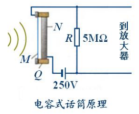 如图所示,Q是绝缘支架,薄金属膜M和固定电极N形成一个电容器,被直流电源充电。当声波使膜片振动时,电容发生变化,电路中形成变化的电流,于是电阻R两端就输出了与声音变化规律相同的电压。