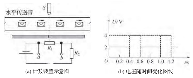 例1.如图(a)所示是某生产流水线上的产品输送及计数装置示意图。S为激光源,R1为光敏电阻(有光照时阻值减小),R2为定值电阻,a、b之间接示波器。水平传送带匀速前进,产品通过时会挡住激光源发出的光线。示波器显示的电压随时间变化图像如图(b)所示。若计数器电路中的电源电压恒为 6V,电源内阻忽略不计,定值电阻 R2=1kΩ,求